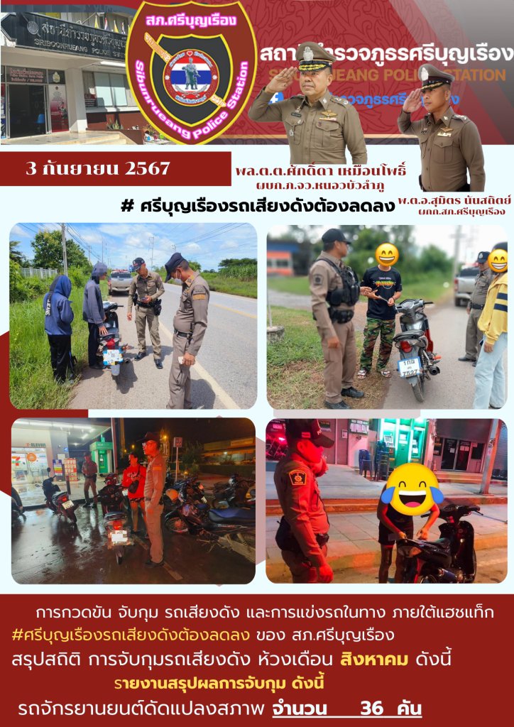 สภ.ศรีบุญเรือง รายงานผลการจับกุมรถเสียงดังห้วงเดือนสิงหาคม 2567