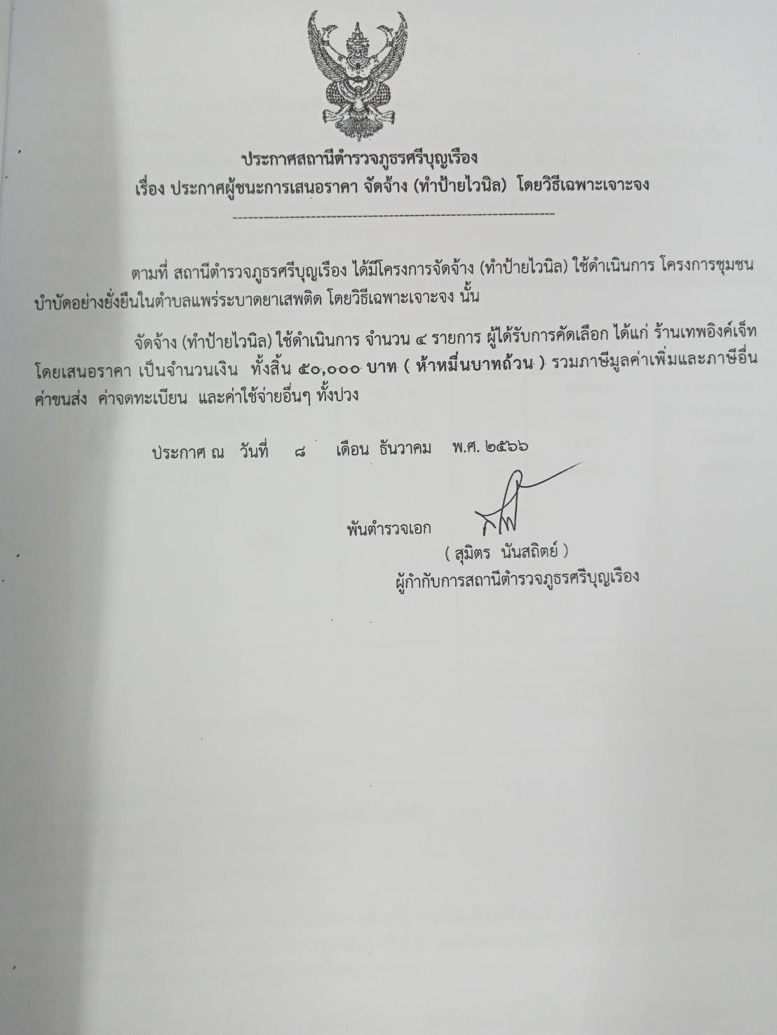 ประกาศ ผู้ชนะการเสนอราคาจัดจ้าง ทำป้ายไวนิล แบบเฉพาะเจาะจงได้แก่ ร้านเทพอิงค์เจท สาขาอำเภอศรีบุญเรือ