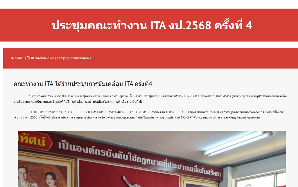 10 กุมภาพันธ์ 2568 เวลา 09.00 น. พ.ต.อ.สุมิตร นันสถิตย์ ผกก.สภ.ศรีบุญเรือง เป็นประธาน ประชุมการขับเคลื่อนการทำงาน ITA 2568 ณ ห้องประชุม สถานีตำรวจภูธรศรีบุญเรือง มีวัตถุประสงค์เพื่อแขับเคลื่อนและติดตามการดำเนินงานของเจ้าหน้าที่ ให้มีการดำเนินการอย่างต่อเนื่องโดยผลการดำเนินงานเป็นดังนี้